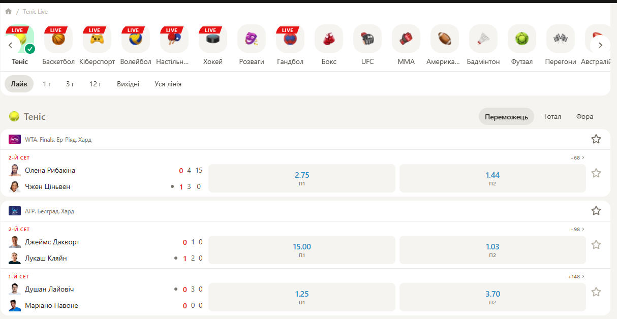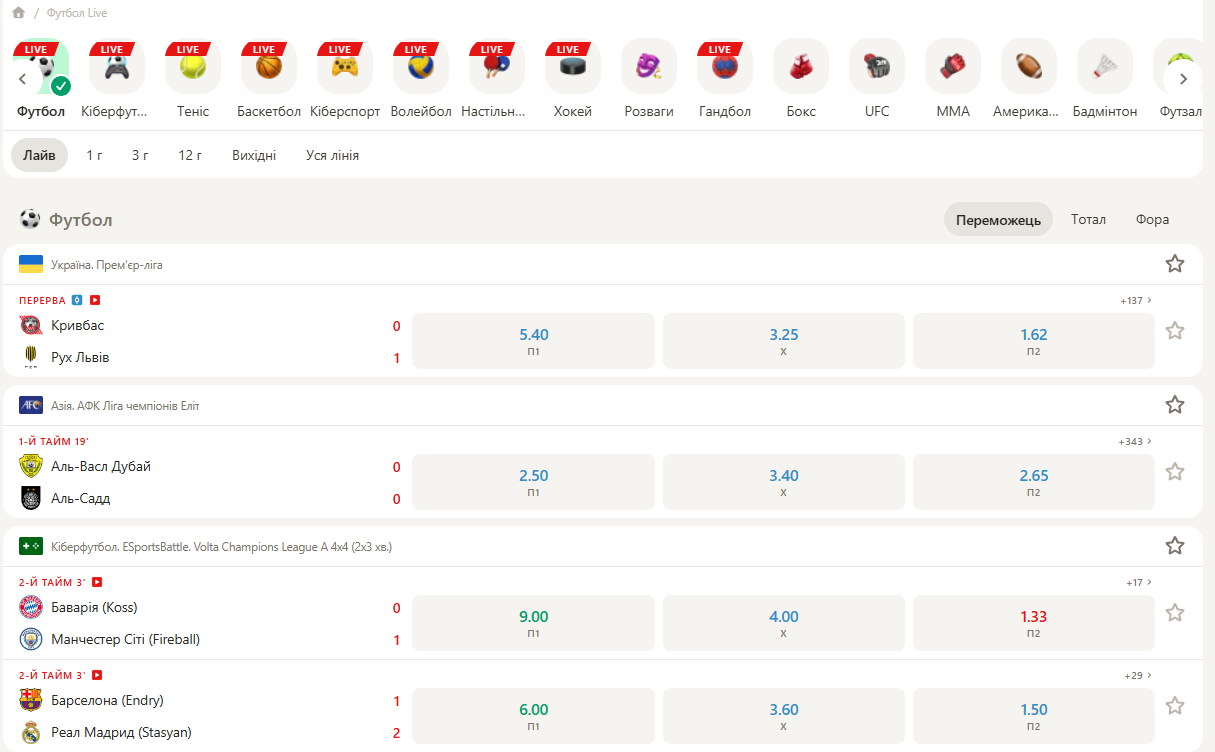 Бетори можуть ставити на тисячі матчів щоденно у прематчі та режимі Live. Найбільшою популярністю користуються футбольні матчі, але гравцям доступні більш екзотичні види спорту на кшталт кабадді або сквоша.