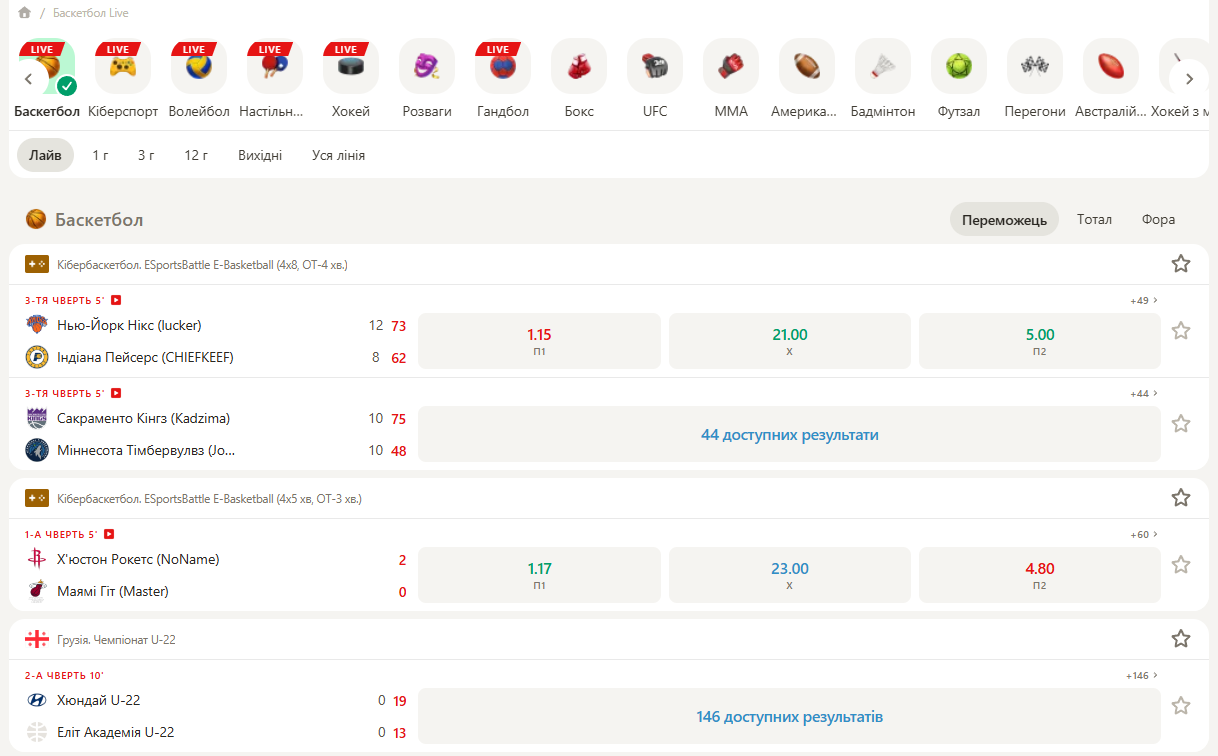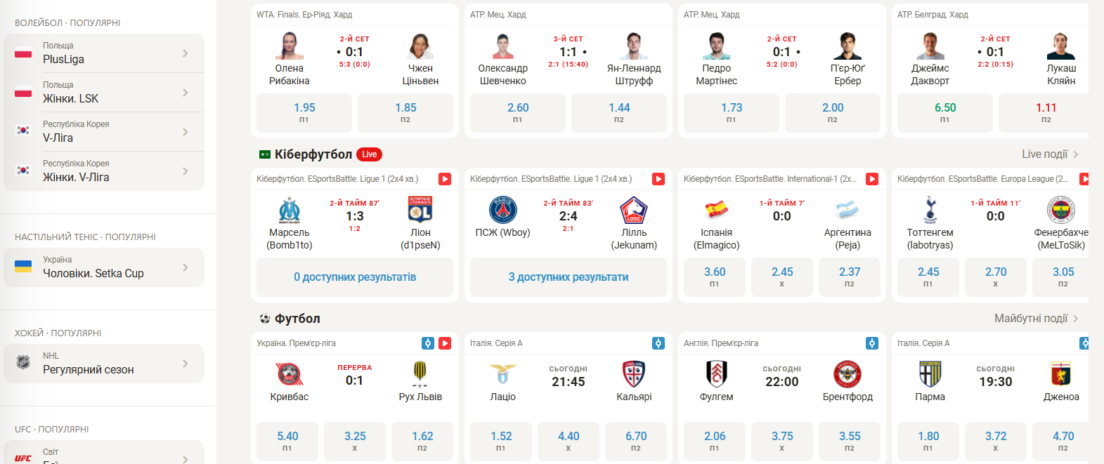 Кількість доступних матчів складає приблизно 40 кожного дня. Коефіцієнти для подій у прематчі складають приблизно 5-7%, у Live кефи зазвичай трохи вище та складають 7-9%. Кількість ринків складає приблизно до 500 на популярні події та 100-200 на менш очікувані.