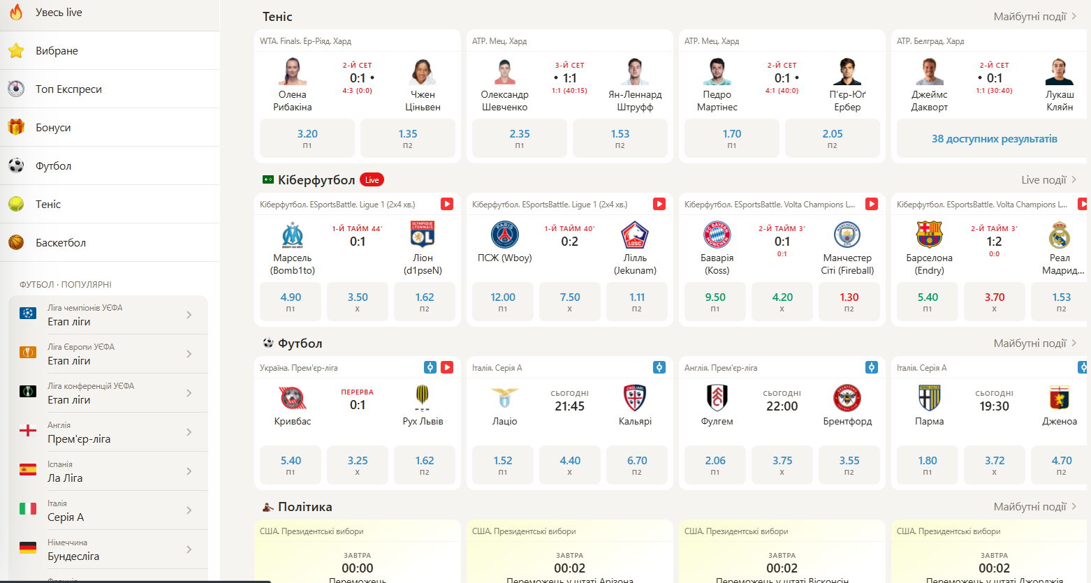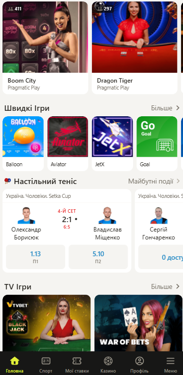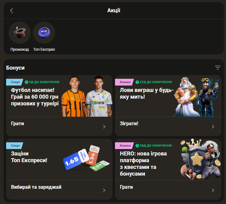 Трохи нижче розташований блок з інформацією про актуальні акції та спеціальні пропозиції для наших гравців. Основну частину сторінки займає блок з топовими спортивними подіями або найкращими ігровими автоматами. У нижній частині ви знайдете посилання на правила та умови, принципи відповідальної гри, контакти служби підтримки, список платіжних засобів та партнерів, юридичну інформацію.